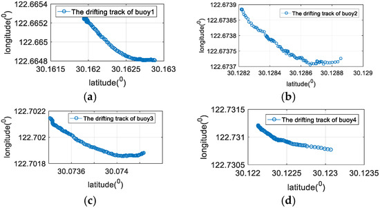 The drifting track of four buoy beacons. (a) The drifting track of the buoy 1; (b) the drifting track of the buoy 2; (c) the drifting track of the buoy 3; (d) the drifting track of the buoy 4.