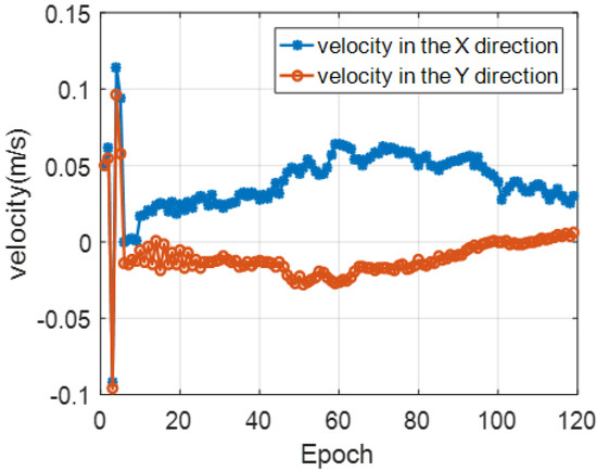 Figure 14 is the result of the modem position of the buoy 3. The blue line with in the figure is the GPS measurement result, and the red line with is the position of the buoy modem after spatial position calibration. It can be seen that the compensated modem position lags a certain distance behind the buoy drifting trajectory. Figure 15 shows the results of the drifting speed of the buoy 3. Due to the influence of the anchor block, the drifting speed is relatively low.
