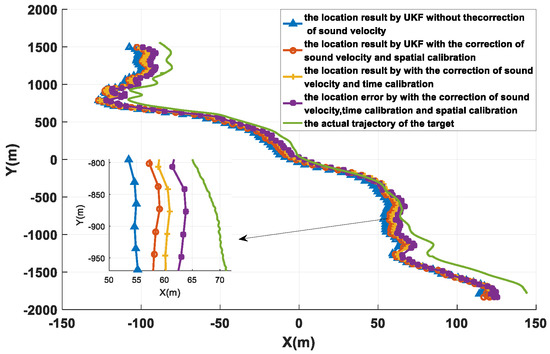 It can be seen that with the sound ray correction, spatial calibration, and time calibration algorithm, the positioning result of the mobile node is closer to the true trajectory, and the positioning error is less. The underwater acoustic network positioning method based on spatial-temporal self-calibration proposed in this paper can effectively reduce the positioning error of underwater mobile nodes and improve the positioning accuracy after sound ray correction and spatial-temporal calibration.