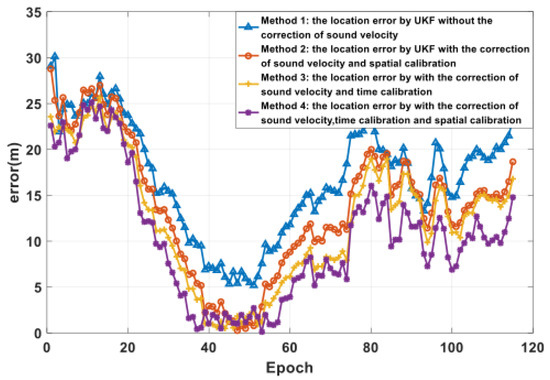 Figure 11 shows the positioning results of the AUV with different methods. The blue line in the figure is the positioning error obtained without the spatial-temporal calibration or the sound ray correction. With sound ray correction, the orange + line and the red line correspond to the positioning result after spatial calibration and time calibration, respectively. The purple line is the positioning error corresponding to the algorithm proposed in this article, and the blue ⊲ line is the positioning error corresponding to the PCRB threshold. Table 2 shows the statistical results of the horizontal error. Methods 1 to 4 in the table correspond to the methods represented by the first four curves in the annotation box in the upper right corner of Figure 11. It can be seen from the data in the table that the algorithm (method 4) proposed in this paper reduces the positioning error and improves the horizontal positioning accuracy.