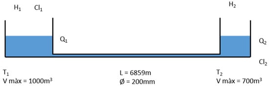 Two parts of the network were used in this study: the transport network and the district metered area (DMA). The transport network (Figure 2) consists of two water storage tanks (T1 and T2) equipped with sensors for chlorine concentration (input of T1 (Cl1) and output of T2 (Cl2)), flowmeters (outflows from the tanks, Q1 and Q2), and water level (H1 and H2). Water flows from T1 to T2 through a 6859 m main. T2 is a boosting station with known sodium hypochlorite (Apliclor Water Solutions S.L., Sant Martí Sesgueioles, Spain) addition. The geometry of the tanks (volume) and pipes (length and diameter) are known. Water from T2 is distributed to the rest of the network (through Q2) of the DMA.