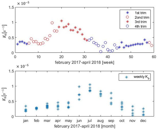 The decay constants Kb obtained are presented in Figure 4. In the upper graphic, the weekly evolution between February 2017 and April 2018, can be observed. A different icon was used for the data of each trimester to clearly identify the season of the year. In the lower graphic obtained, Kb are grouped by month to observe how this parameter evolves throughout the year (some months include estimations of both years). It seems clear that there may be a seasonal variation related to temperature.