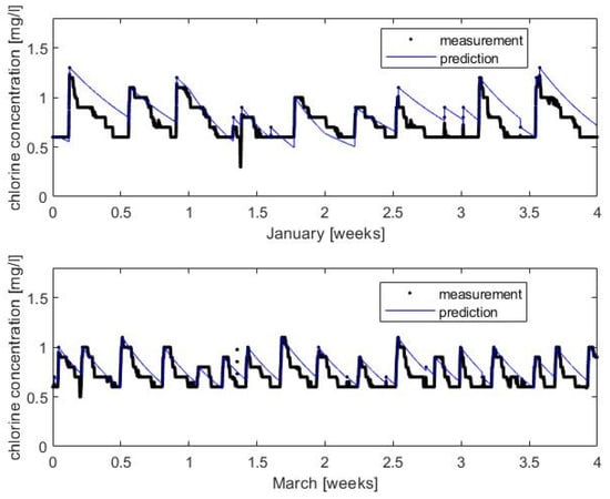 The calibrated model was applied to the peak episodes observed at the output of T2 due to the rechlorination and mixing effect. The dataset used in this validation was not used for the estimation. The dataset for calibration consisted of the mean values corresponding to the stationary state. Figure 5 shows the chlorine concentration data and the model prediction. It can be observed how this high-frequency dynamic is adjusted with the model obtained with the mean values. For this prediction, Kb evolves weekly.