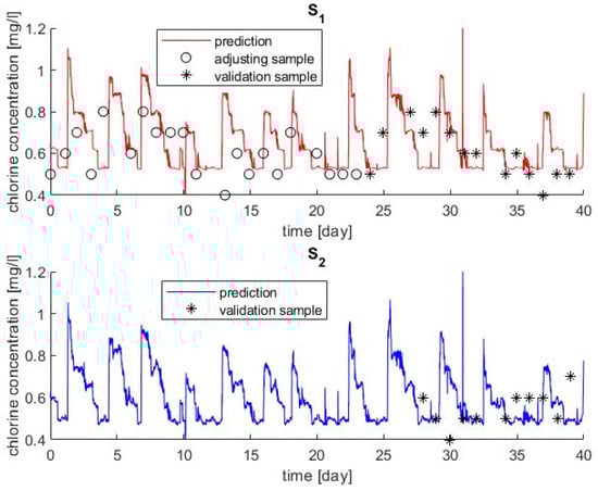 For the distribution network simulation, a relation between the transport Kb, estimated by on-line calibration, with the distribution Kb* was obtained by adjusting the concentration in the training set of chlorine sampling. This relation was applied to the entire period and the predicted concentration was compared with the measurements for the validation set of samples. A total of 40 days were simulated. The decay constant for both the bulk and wall were fitted using the first 21 samples of the chlorine concentration in S1. These are the first samples of upper graphic in Figure 6.