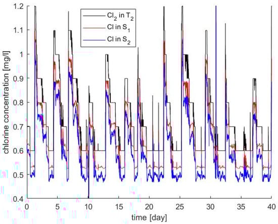 Measured chlorine concentration at the source (T2) and prediction at the two sampling points (S1 and S2).