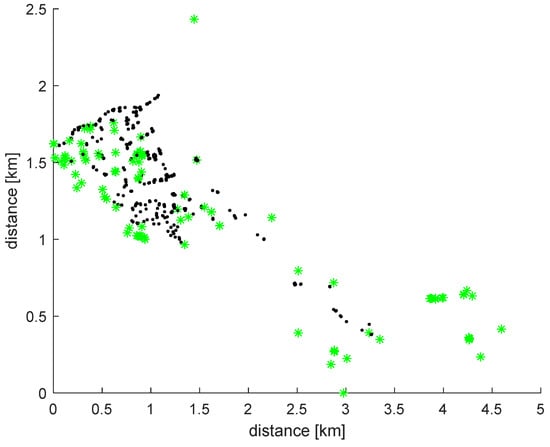 Finally, Figure 8 shows the network nodes colored by their chlorine concentration: green, black, or red, depending on whether their concentration is too low, acceptable, or too high, respectively. In fact, no red points exist in this area and period. Such a representation is very useful in order for the network operator to make decisions. Nodes in this figure correspond to those in Figure 3 and are presented with north at the top.
