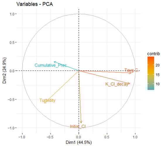 Results from the PCA applied to the decay constant (K_Cl_decay) determined in the distribution network and other data available (temperature as Tavg_C, initial chlorine concentration as Initial_Cl, cumulative precipitation as Cumulative_Prec, and turbidity at the drinking water treatment plant) are shown in Figure 9.