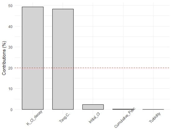 In this case, dimension one was related to the temperature, and dimension two was related to the initial chlorine concentration. Therefore, the decay constant was closely related to the temperature. Figure 10 shows the variables that had the most influence on dimension five, which were again the temperature and the chlorine decay, demonstrating the clear strong relation of the temperature on the decay constant.