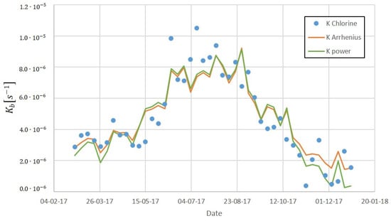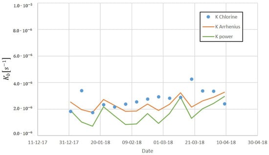 where, Kpower, a, and A are constants, Ea is the activation energy (Jmol−1), R is the universal gas constant, and T is the temperature. Finally, the parametrized chlorine decay model was compared with that obtained in the on-line calibration to assess its coherence throughout the year.