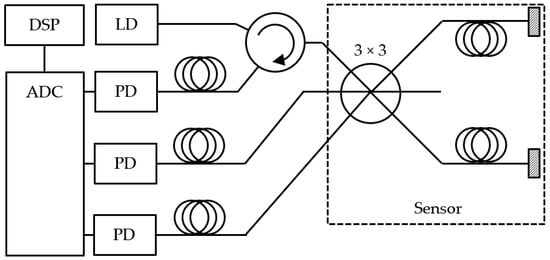 A demodulation technique is essential to unwrap the phase shift and acquire the sensor data. Several different methods can be used for this purpose, one of which is homodyne demodulation []. The passive variant works on the principle of symmetry of the 3 × 3 coupler having three mutually phase-shifted outputs []: