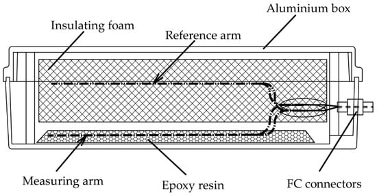 The sensor consists of a 3 × 3 coupler, and one pair of fiber mirrors with a fiber length of 3 m. The layout of the internal sensor can be seen in Figure 3. The outer case of the sensor consists of a waterproof aluminum box with dimensions 253 × 159 × 72 mm. A measuring arm in the form of a fiber mirror was attached to the bottom of the box using epoxy resin. A reference arm of the same optical length (within the coherence length of the LD used) was loosely placed in vibroacoustic insulating foam to minimize the transmission of vibrations to this arm. Optical FC connectors were built into the front panel that represent the input and output ports of the sensor. The sensor was connected to the evaluation site by a 100 m-long multi-fiber-optic cable.