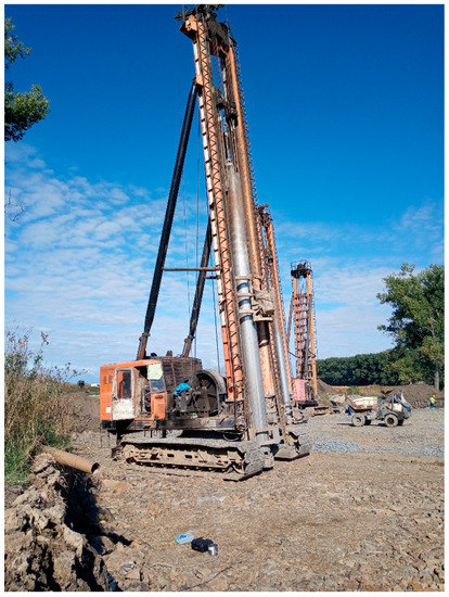 The most typical use of gravel piles, however, is under new embankments to limit consolidation while strengthening the subgrade. The consolidation limitation is implemented by shortening the drainage path, which is reflected in the design of the pile grid []. For this purpose, gravel piles were also installed at the site where the experimental measurements presented in this article were carried out.