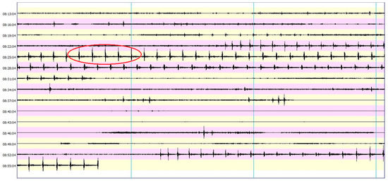 For further processing, only those data were selected that corresponded to the pre-driving phase in the Franki pile process, and the highest vibrations are generated in this phase. The set of five consecutive most powerful blows of the hammer was always chosen. An example of a data set from the BRS32 seismic station, directly from the BRSmonitor seismic data processing software, with five marked seismic events is shown in Figure 5.