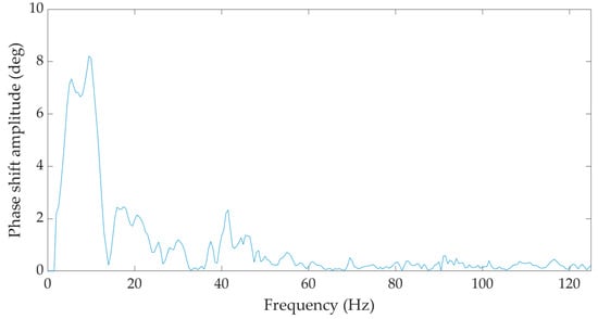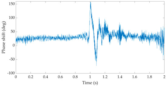 Figure 7 is an example of a recording of one hammer strike during the implementation of a gravel pile obtained on the basis of optical interferometer measurements at a distance of 9 m from the implemented pile—measurement diagram M4.1a (see Figure A1d). Time is plotted on the horizontal axis and the vertical axis represents the phase response in degrees.