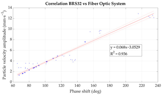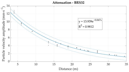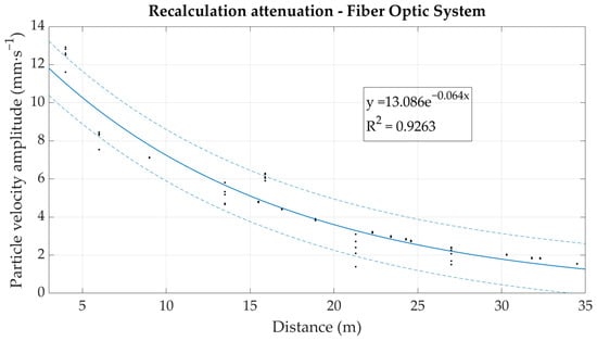 Based on the correlation relationship in Figure 10, the measured values obtained from the fiber-optic system under development were converted to particle velocity in mm·s−1. These were subsequently plotted in the form of an attenuation curve (dependence of the maximum amplitude on the distance from the dynamic load source), see Figure 11. For comparison, this dependence was also plotted from the values obtained from seismic station BRS32, see Figure 12.