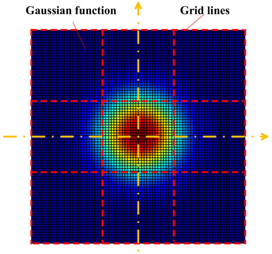 On this basis, we can obtain the value of each element in the Gaussian kernel, G. Specifically, we can first draw grid lines in a plane, and the intervals between grid lines are equivalent to the pixel size. Then, we assume the center of the Gaussian function is in consistent with the center of the central square in the grid, as shown in Figure 1, and calculate the weighted sum of the Gaussian function in each square in the grid through integration in each square. The number of the squares in the grid (i.e., the number of the elements in the Gaussian kernel) is usually 3 × 3 or 5 × 5. Note that the sum of element values in the Gaussian kernel should be normalized to 1.