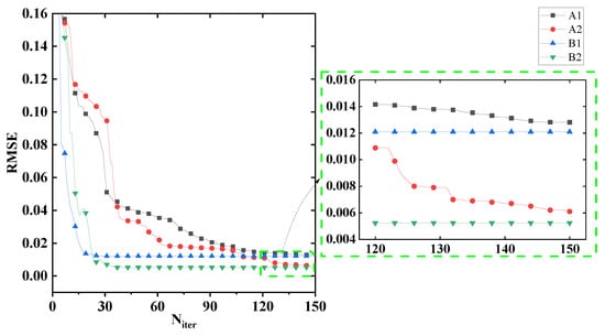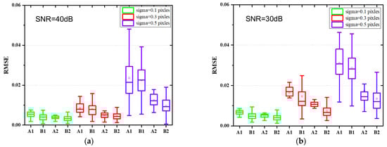 Monte Carlo simulations are further presented to demonstrate the effectiveness of the proposed jitter-robust approaches. Here the number of aberration coefficients considered is increased to 36. A total of 100 sets of aberration coefficients are randomly generated within the range of [−0.5λ, 0.5λ], and 100 pairs of PSF images are then generated according to the simulation process presented in Section 3.1 and certain system parameters (mainly including aperture size, focal length, pixel size, wavelength, defocusing distance) for a certain jitter parameter. Three jitter parameters (sigma = 0.1 pixels, 0.3 pixels, and 0.5 pixels) and two noise levels (40 dB and 30 dB) are considered for each PSF image (and therefore there are 600 pairs of PSF images in total). The two traditional phase retrieval algorithms (A1, B1) and the two jitter-robust phase retrieval algorithms (A2, B2) are applied to each pair of the PSF images. RMSE of each algorithm are calculated and analyzed. The results are presented in Figure 6.
