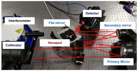 Real experiments are performed to demonstrate the effectiveness and practicality of the proposed jitter-robust algorithms. A physical map of the optical path used to generate PSF images including the effects of jitter is shown in Figure 7. Importantly, a hexapod is used to change the pose of a flat mirror, which determines the direction of the optical axis (pointing direction). A large number of pointing change values are randomly generated for a certain magnitude of variance and introduced to the optical system to represent the effect of jitter, and a PSF image is collected each time the pointing is changed (the position and pose of the flat mirror with respect to the hexapod should be carefully determined). By superimposing all these images (100 images), a final PSF image is obtained to represent a real PSF for a certain magnitude of jitter. In this experiment, the variances of the pointing change are selected as 0.1 pixels, 0.3 pixels and 0.5 pixels (this value should be converted to the pitch and torsion angle of the hexapod), respectively. Traditional phase retrieval algorithms and the jitter-robust phase retrieval algorithms are applied to these PSF images.