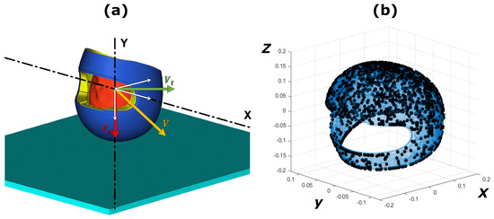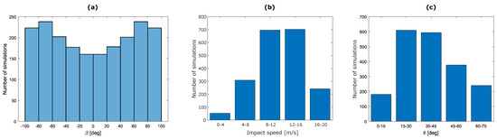 Figure 4b,c show, respectively, the distribution of the impact speed and the angle between the impact speed direction and the ground. Most of the impact simulations are characterized by an impact speed magnitude within the range of 8–16 m/s and an inclination angle within the range of 16–45.