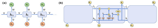 The long-term dependency was improved with the Long Short-Term Memory (LSTM) structure, introduced by Hochreitener and Schmidhurber [42] for the first time in 1997. They replaced the typical recurrent unit of RNNs with a more complex gated recurrent unit. The LSTM used in this study is a standard LSTM, and it is shown in Figure 2b. The LSTM forward propagation process is described mathematically: