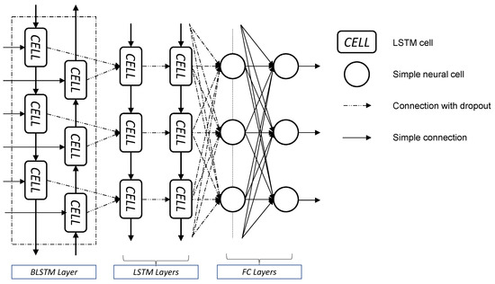 A simple Neural Network with a single LSTM layer did not provide good performances in the impact force history identification, as stated by Zhou [29]. Assuming that the same conclusion can be considered for the estimation of impact acceleration, the deep neural network architecture used by Zhou [29] was the starting point for this study. Some improvements were identified to maximize the performance for the specific problem, and the final architecture is shown in Figure 3. It consists of a Bidirectional Long Short-Term Memory (BLSTM) layer, two LSTM layers and two Fully Connected (FC) layers. Basically, a BLSTM layer consists of a forward LSTM layer and a backward LSTM layer. This provides the opportunity to consider both past and future responses of sequential inputs. BLSTM and the two LSTM layers have 200 cells per layer, the first FC layer has 200 hidden units, but the last FC layer has a number of hidden units equal to the number of outputs. The over-fitting was prevented using the dropout operation to each non-recurrent connection, as shown in the dashed lines in Figure 3. From here onwards, this neural network architecture will be referred to as deep Artificial Neural Network (dANN).