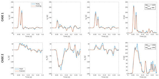 The dANN reproduces the acceleration component’s shape and the peak values in both cases well (Figure 5). Peak values and HIC were calculated on the entire testing dataset (300 simulations). Scatter plots in Figure 6 show the comparison between peak values of the target and estimated acceleration components. Peaks of the Z-component had the best overall performance with . Parameters calculated on the resultant acceleration, i.e., peak value and HIC, had similar high values, confirming the strong learning ability of dANNs (Figure 7).
