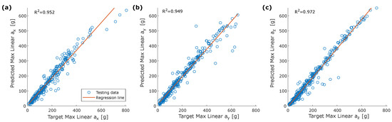 Correlation between target and predicted peak linear acceleration: (a) ; (b) ; (c) .