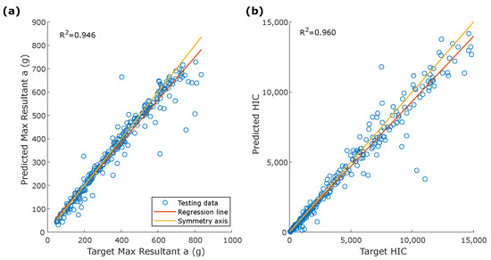 Correlation between (a) target and predicted peak for the resultant linear acceleration and (b) target and predicted HIC.