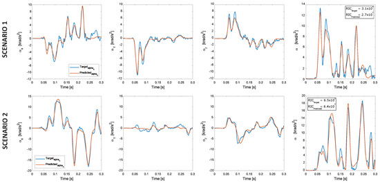 Looking at the comparison between the target and estimated peak values of the resultant rotational acceleration (Figure 10a), the network underestimates the target values starting from a target peak of 40 krad/s. This is confirmed by a smaller slope of the regression line compared to the symmetry axis. The network performance is affected by the small number of impacts with high rotational acceleration in the datasets (143 out of 2000 in the training dataset, 28 out of 300 in the testing dataset with a peak of rotational acceleration exceeding 40 krad/s). This result is a consequence of the procedure used to generate the databases: the position of the helmet with respect to the ground and the impact speed is defined, and the accelerations of the head–helmet system are a consequence of these parameters. Nonetheless, the network performances need to be properly framed within the physiological limits of the human body and take into account the overall objective of the research (i.e., early detection and treatment of TBIs). From this context, acceleration values, which cause immediate and permanent brain damage, should be clearly excluded.