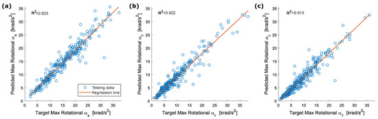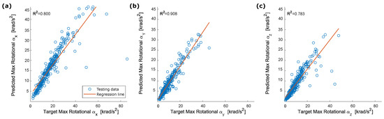 Correlation between target and predicted peak rotational acceleration: (a) ; (b) ; (c) .