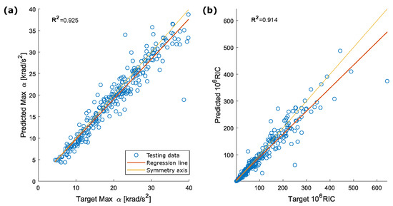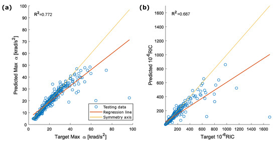 Correlation between (a) target and predicted peak for the resultant rotational acceleration and (b) target and predicted RIC for the reduced testing dataset (exclusion of impacts with peak rotational acceleration above 40 krad/s).