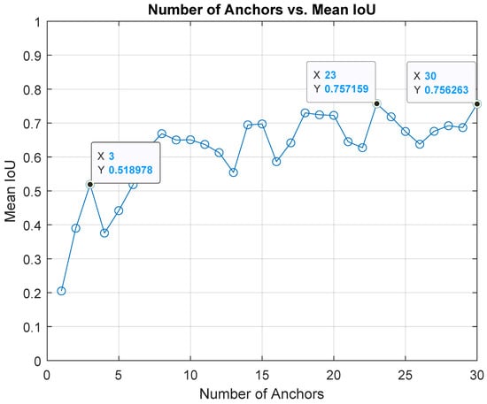 Three data points are selected to understand the impact of the anchor boxes on the detector performance (Figure 2). First, the point at which the mIoU is more than or equal to 0.5 with the lowest number of anchor boxes (number of anchor boxes = 3, mIoU = 0.518). Second, the point at which the highest mIoU can be achieved (number of anchor boxes = 23, mIoU = 0.757). Third, the point with the highest number of anchor boxes (number of anchor boxes = 30, mIoU = 0.756).