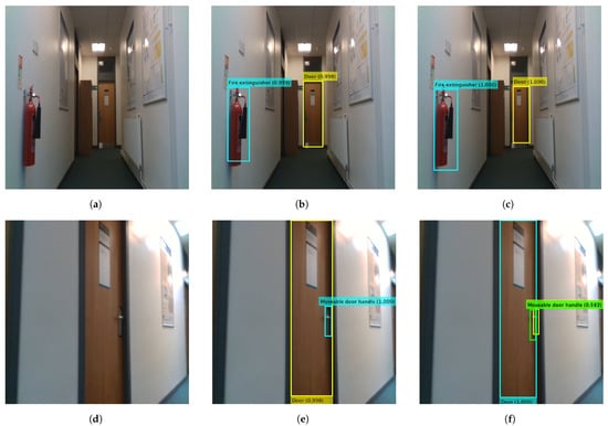 Figure 3 shows detection examples of the best performing Faster R-CNN (with 23 anchor boxes and res4b_relu feature extraction layer) and YOLO V3 (with three anchor boxes, res4b_relu feature extraction layer and trained using augmented training data) single head detectors on two test images. The two networks can predict the class categories and the bounding boxes with high confidence. However, Faster R-CNN predicts two bounding boxes for the same object (the moveable door handle in Figure 3f), one with a high confidence score of 0.99, while the second confidence score is relatively low (0.58). The confidence score threshold value used in the experiments is 0.5. A higher threshold value can discard the second box. Other Faster R-CNN detectors find it challenging to detect all the objects in the test images.