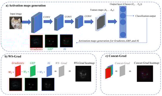Figure 5c shows the concatenated gradients approach. Similar to WS-Grad, Gradient-based heatmaps are generated. Then, the generated maps are weighted and concatenated as a single image with three channels (Equation (11)).
