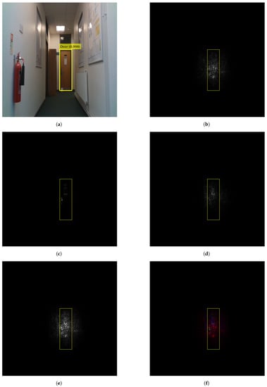 Gradients based attribution methods and the proposed methods to visualise the door prediction using YOLO V3. (a) YOLO prediction. (b) Gradient. (c) GBP. (d) IG. (e) WS-Grad (proposed). (f) Concat-Grad (proposed).