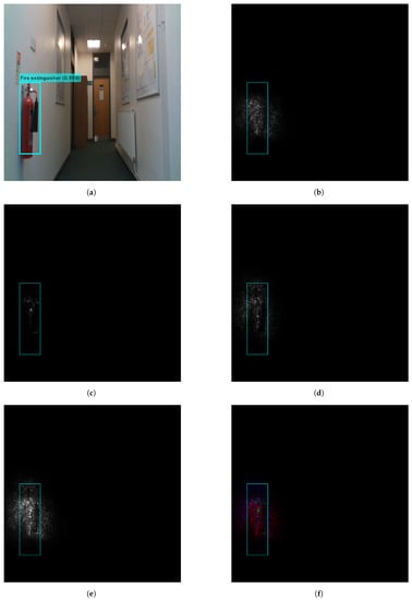 Gradients based attribution methods and the proposed methods to visualise the fire extinguisher prediction using YOLO V3. (a) YOLO prediction. (b) Gradient. (c) GBP. (d) IG. (e) WS-Grad (proposed). (f) Concat-Grad (proposed).