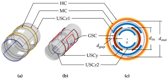 Figure 2 shows this novel arrangement of the divided USCz. For two pipes, this arrangement was the only possible case. The MC and GSC were then placed in the empty spaces. The MC was placed on the outermost side of the MNS because it could be overlapped with the HC. In contrast, the GSC could be overlapped with USCy or USCz. The GSC could generate the strongest magnetic field gradient if it is placed with USCz; however, in this case, the GSC reduced the inner space of the MNS because the GSC was thicker than the divided coil (USCz2). Thus, we placed the GSC with USCy.
