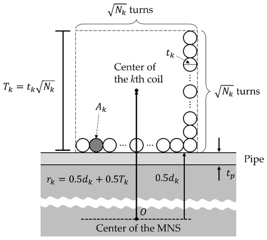The design variables and parameters of the k-th coil. This cross-section shows the case in which the coil is attached to the outside of the pipe.