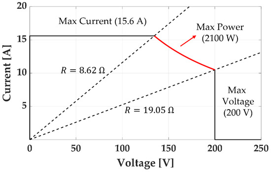 In Equation (15), and are not considered separately because they are connected in series. Instead, their summation () is considered as . We also consider the inductance of the coils (). The inductance effect attenuates the time-varying current of the coils. Thus, a small inductance is advantageous for generating a strong time-varying magnetic field. Because the inductance is proportional to , we can obtain a small inductance by reducing . However, this also reduces in Equation (6) by increasing and decreasing to keep constant. Thus, we can minimize the inductance by minimizing the resistance. However, we should consider the range of to utilize the maximum power of the power supply unit. Figure 4 shows the output range of the power supply unit (3001iX by California Instruments); the resistance must be in the range of 8.62 Ω ≤ ≤ 19.05 Ω to utilize the maximum power. Then, the available minimum resistance becomes 8.62 Ω to minimize inductance of each coil, and we obtain the following resistance constraint: