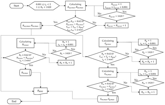 We developed an optimization algorithm using Equations (10) and (11) and the given constraints, shown in Figure 5. We set the range of the two design variables as and . The range of was determined using Equation (17), and its minimum incremental value was 0.001 mm. The maximum number of turns of wires between the pipes was 1420 when had a minimum value of 0.001 mm. Thus, the maximum limit of was 1420. Using this algorithm, we obtained the optimized MNS as shown in Table 1. Because the mathematic functions in Equations (10) and (11) were utilized for the algorithm, the calculation time for each step was very short. Thus, the results of the optimization could be obtained in a few seconds.