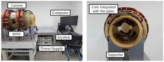The optimized MNS was constructed, as shown in Figure 6, and the major variables were measured, as shown in Table 2. Each coil was connected to a power supply unit (3001iX, California Instruments). A magnetic robot inside the MNS was tracked using a real-time camera and was controlled by a joystick controller. The two pipes for the coils were made of fiber-reinforced plastic that could withstand the weight and heat of the coils. Plastic is a nonmetallic material; therefore, the pipes have no iron loss that attenuates the magnetic field. In contrast, the structure used to support the pipes was made of metallic aluminum. Although aluminum can cause iron loss, it does not affect the magnetic field inside the MNS because the structure is located outside the coils.