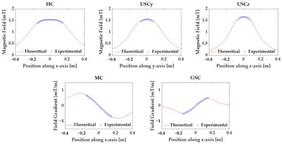 We also measured the magnetic field near the center of the MNS to verify the spatial homogeneity of the magnetic field. During the experiment, a current of 1 A was applied to each coil, and the magnetic field was measured using a Gauss meter (Model 8030 by F. W. Bell). We calculated the magnetic field of each coil considering the correction factor, and Figure 7 shows the comparison between the calculated and measured magnetic field. We confirmed that the magnetic fields of the HC and MC matched well with the calculated values. However, the saddle coils had relatively large error at the outside of the center because they could not be ideally constructed due to their complex geometry. In particular, the maximum error of 2.9% was measured at the USCy which had the maximum thickness of wire.