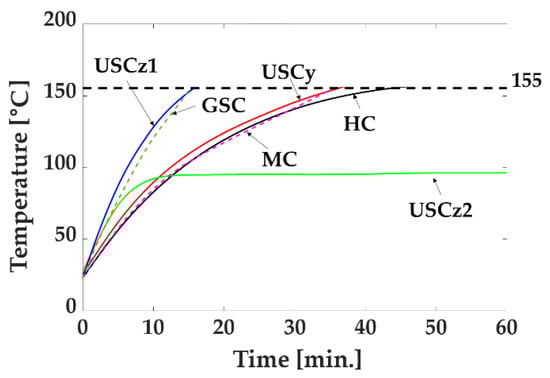 The electrical insulation system for the wires was divided into different classes by temperature; we used an F-class wire for each coil. The F-class wire has an allowable temperature of 155 °C; this must be a temperature limit for safe use. The temperature rise due to the current of the coils was measured using an infrared thermometer, as shown in Figure 8, while the maximum output power was utilized. To obtain an average value, the temperature was measured at six points on each coil. Only USCz2 demonstrated an unlimited operating time because its temperature converged at 96 °C, while the temperatures of the other coils rose over 155 °C. In the figure, the USCz1 had the minimum operating time limit of 16 min, which can be considered the operating time limit of the MNS. However, when a magnetic robot is actuated, each coil operates discontinuously below the maximum output power. Thus, the practical operating time limit of the MNS would be longer than 16 min. For example, if we generate a 2D rotating magnetic field of 15 mT in the xy-plane, the operating time limit would be much longer than 40 min because we discontinuously utilize the HC and USCy below the maximum output power.