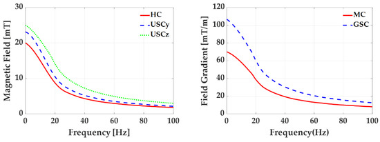 where and are the input voltage and frequency of the power supply unit for the k-th coil, respectively. Because the magnetic field is proportional to the current in Equation (3), the calculated maximum magnetic field and field gradient in Table 1 cannot be obtained with this current drop. Figure 9 shows the measured maximum magnetic field and field gradient with a variation in the frequency. In particular, the amplitude of each maximum magnetic field decreased to 50% or less at 20 Hz. Thus, this inductance effect should be considered if we generate a time-varying magnetic field.