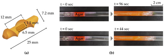 The maximum 3D rotating magnetic field of the optimized MNS was 42% larger than that of the conventional MNS in the static state. This improvement of static magnetic field can enhance the quasi-static motions such as steering motion of a magnetic catheter and sampling motion of a magnetic capsule [2,16,31]. In addition, the optimized MNS can generate a stronger time-varying magnetic field with a smaller inductance effect, because the inductance was improved by 53%. This improvement can also enhance the dynamic motion of magnetic robots. As one example, we compared the unclogging ability of a helical robot in each MNS, as shown in Figure 10. First, the step-out frequencies of the helical robot were measured using the maximum 3D rotating magnetic fields of the two MNSs. The measured step-out frequency of the optimized MNS was 18 Hz, which is 38% higher than the 13 Hz of the conventional MNS. These frequency differences may affect the drilling ability of the robots. As shown in Figure 10b, the helical robot was actuated in front of the clogged area using agar. Considering the frictional energy consumption during the unclogging motion, slightly lower frequencies (17 Hz and 12 Hz) than the step-out frequencies (18 Hz and 13 Hz) were used for each experiment. As a result, the unclogging time improved by 54% from 96 s to 44 s. Because the propulsive force of a helical robot is proportional to the square of the robot dimension [32], larger robots would exhibit a better improvement. In particular, for the magnetic robots actuated in a fluidic flow such as blood flow in a vessel, their drag forces are proportional to the square of the fluidic velocity [24]. Thus, this improvement of the 3D rotating magnetic field would significantly help the magnetic robots to accomplish their mission.