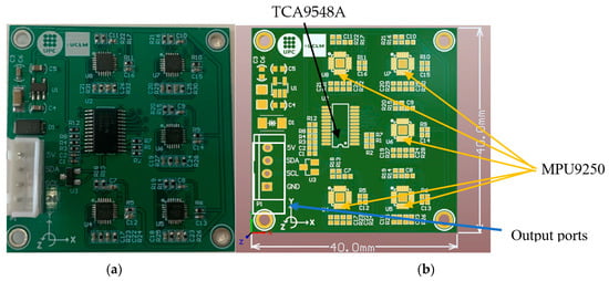 This paper proposes multiple combinations of gyroscopes and accelerometers for producing a more accurate inclinometer. To this end, five chipsets of MPU9250 are engineered together on a single PCB and synchronized using a multiplexor (TCA9548A). To avoid the problems of a manual fabrication (such as nonalignment of the circuits, time-consuming process of aligning, soldering, and sensor quality control and size), the PCB of LARA was designed and produced to satisfy the delicacy of current project measurements. In addition, the required components of LARA are soldered to the PCB using machine assembly. Figure 2a,b shows the produced sensor and its blueprint. It should be noted that LARA can be assembled by hand using available commercial MPU9250 circuits and a TCA9548A multiplexor. Figure 2c shows the Fritzing [74] sketch of the system. The cost of a LARA made by connecting five MPU9250 and TCA9548A and a bulk company-produced PCB with assembled components is around €37 and €51, respectively.