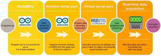 Data acquisition: Unlike the Arduino platform, free commercial software like SerialPlot [79] can represent the sampled data in real-time in a graphical interface and save the data with the date and timestamp of data acquisition. The presented flowchart in Figure 3 shows the steps of real-time inclination acquisition using LARA.