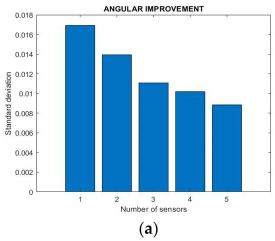 It was noticed that the average value of outputs of several aligned synchronized inclinometers has lower noise density than the those of a single one. The standard deviation of up to five combined inclinometers is presented in Figure 4a.
