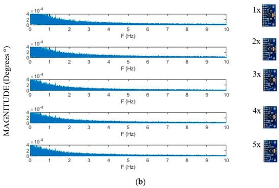 The analysis of Figure 4a shows that the higher the number of sensors considered, the lower the noise density of their averaged measurements that the more combined inclinometers have a lower noise density. The reason behind the beneficial behavior of combined inclinometers is within the inherent dynamic noises of the produced accelerometers and gyroscopes chipsets. Figure 4b shows the frequency domain illustration of the performed experiment. Data transformation from the time domain to the frequency domain is done using fast Fourier transformation (FFT). The analysis of Figure 4b shows that the magnitude of the dynamic noises of the averaged values of a set of sensors made from combined inclinometers is lower than that of a single one. It can be seen that on 1 Hz the measured noises for a single inclinometer and five combined inclinometers are 3.9 × 10−4 and 2.6 × 10−4 degrees, respectively.
