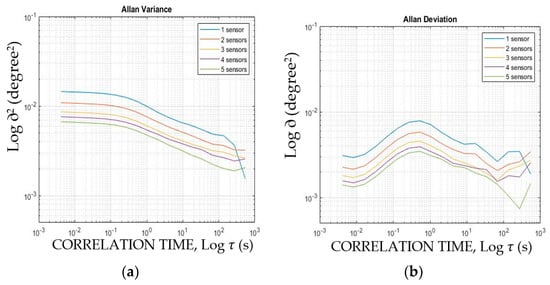 Allan variance is typically used to characterize and analyze those noises that drift throughout time in the time domain series [57]. In fact, Allan variance quantifies the measurement variance of a sensor across different timescales. Contrary to frequency-domain noise evaluation methods such as spectral noise density (ND), Allan variance is a time-domain evaluating tool of different noise sources (such as quantization, angle random-walk, bias instability, rate random-walk, and rate ramp) [80]. Allan variance shows the progress of a noisy sensor signal over time which can be very useful to identifying the progressive random-walk of a gyroscope instead of ND that quantifies the noise density of an accelerometer [57]. Allan deviation is more commonly used as the square root of Allan variance [81]. The available acquired inclination acquisition data for measuring the standard deviation of the previous subsection was used for the Allan variance and deviation calculations. Figure 5a,b shows the log–log plot of Allan variance and Allan deviation of a single and up to five synchronized inclinometers, respectively.